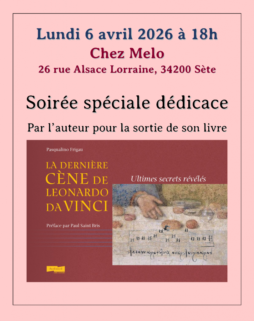 Le livre que Pasqualino vous avait présenté lors de sa conférence de janvier 2025 est disponible dans toutes les librairies de Sète et sur commande chez votre libraire préféré ou directement chez l’éditeur: https://www.audasud.fr/boutique/La-Derniere-Cene-de-Leonardo-daa-Vinci-p797811510